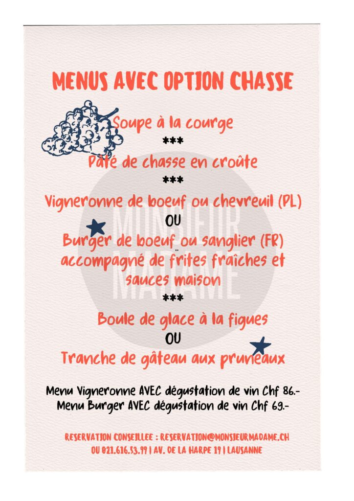Les participants auront l’occasion de savourer une sélection de vins accompagnés d’un menu spécial avec dégustation de vins pour 69CHF ou avec option chasse pour 86CHF visible ci-dessous. La réservation est vivement conseillée !